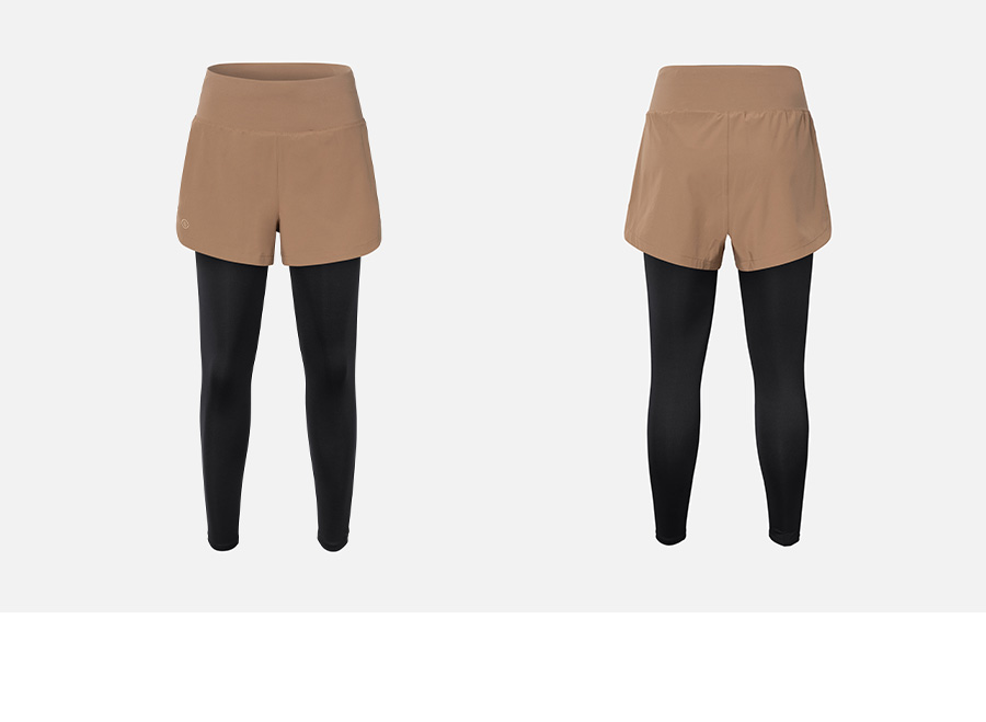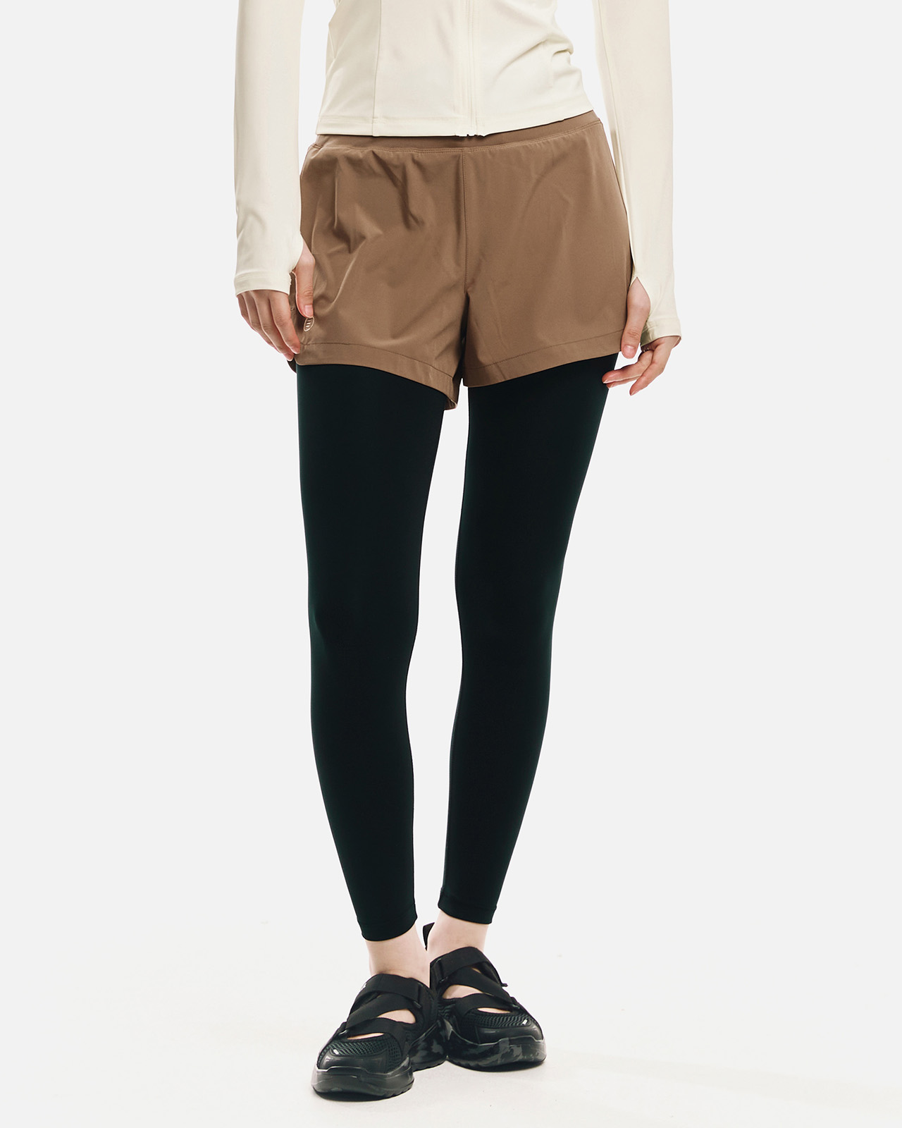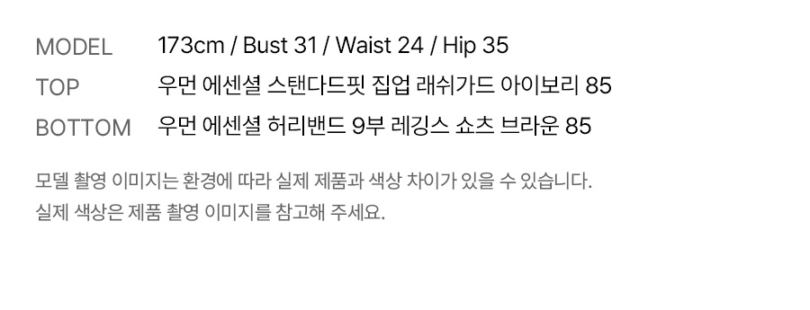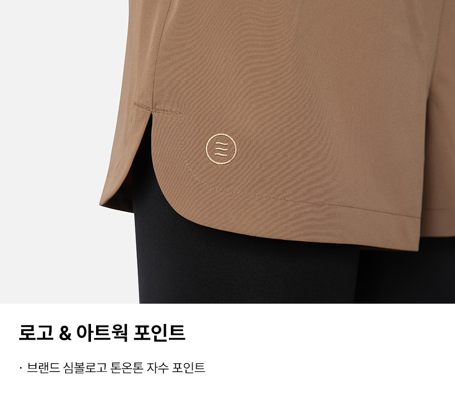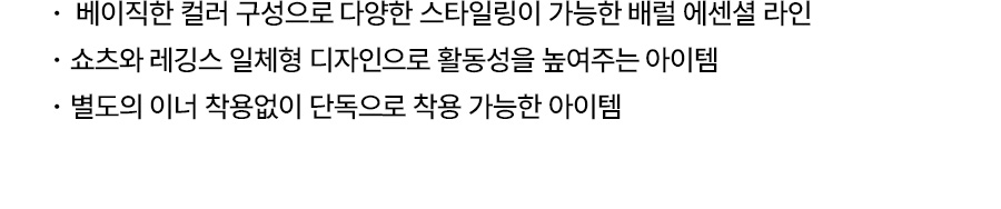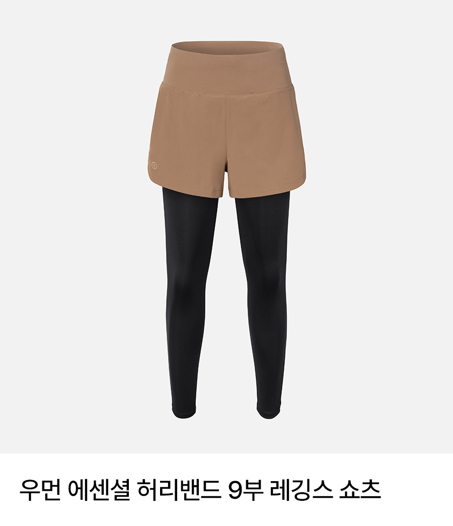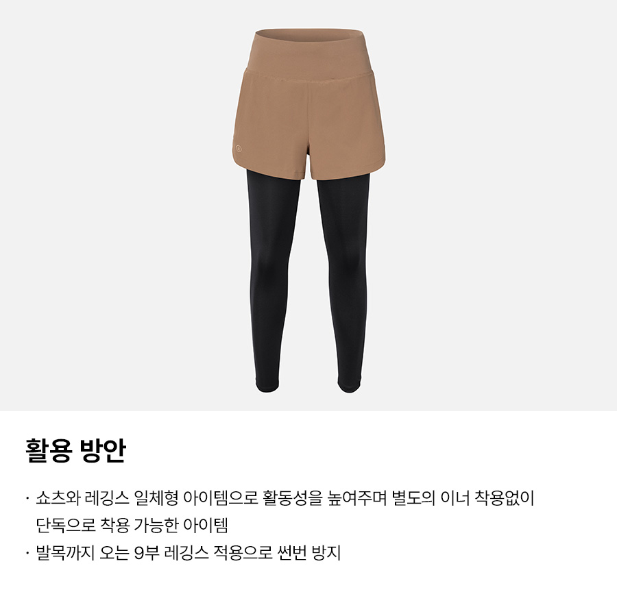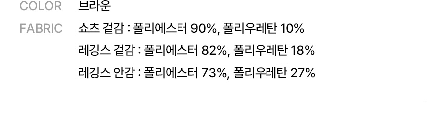 쇼츠 겉감: 폴리에스터 90%, 폴리우레탄 10% / 레깅스 겉감: 폴리에스터 82%, 폴리우레탄 18% / 레깅스 안감: 폴리에스터 73%, 폴리우레탄 27%