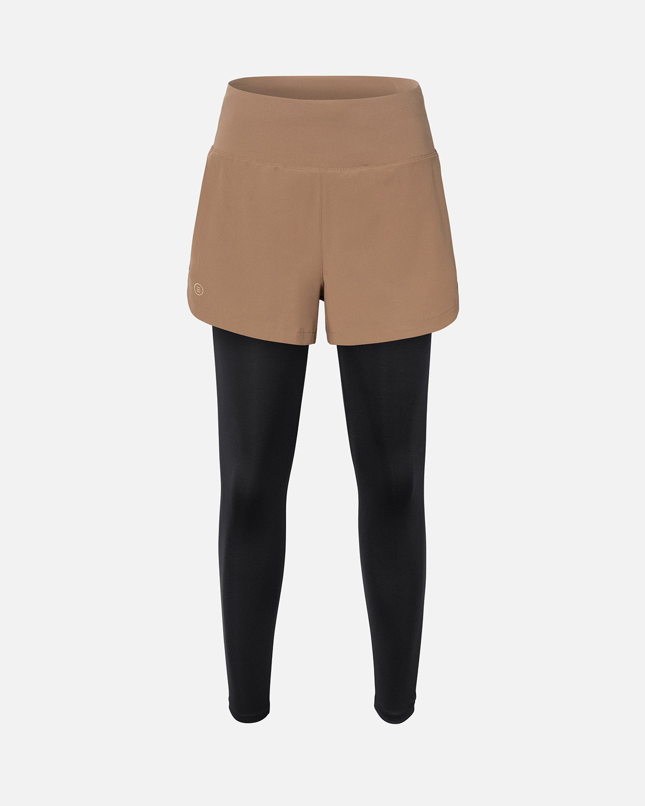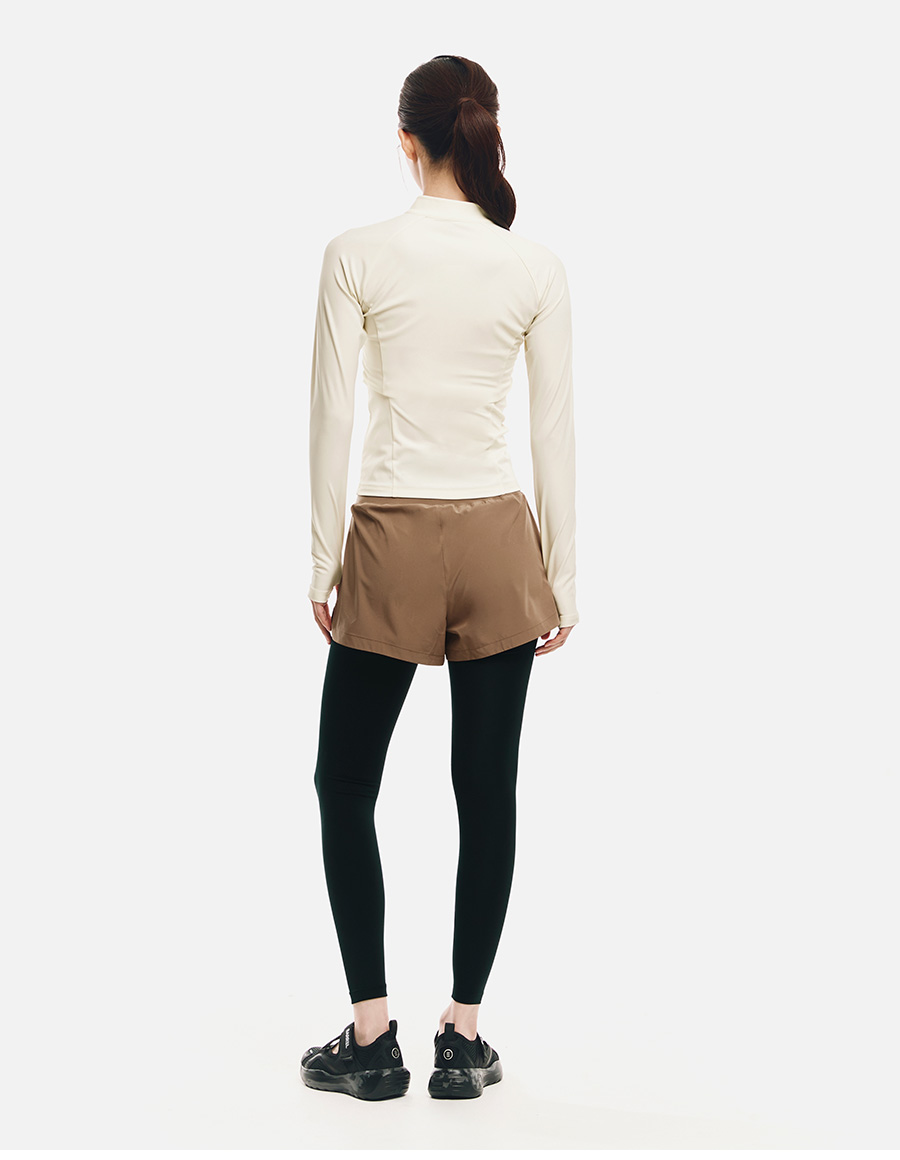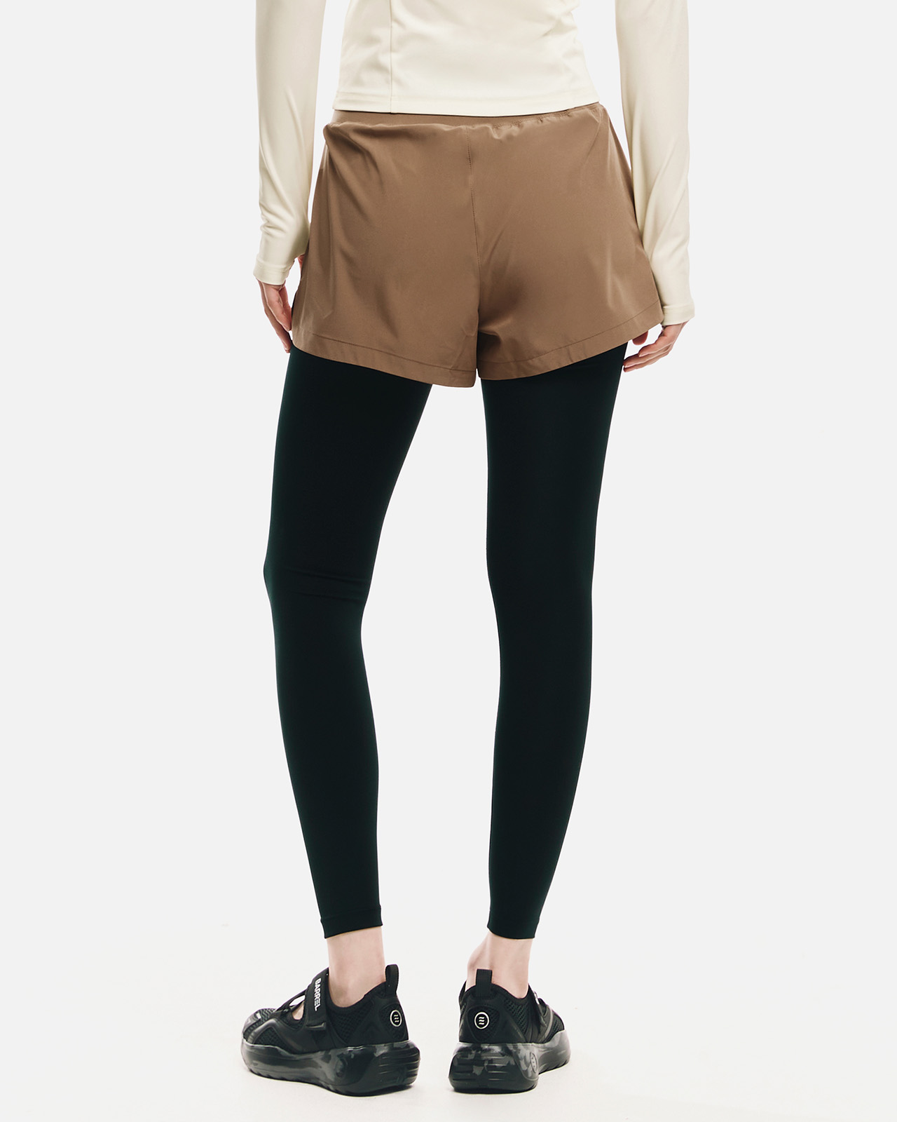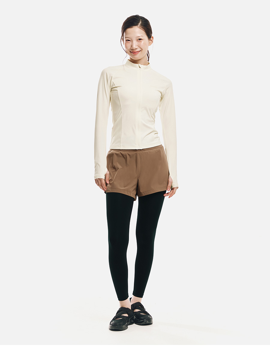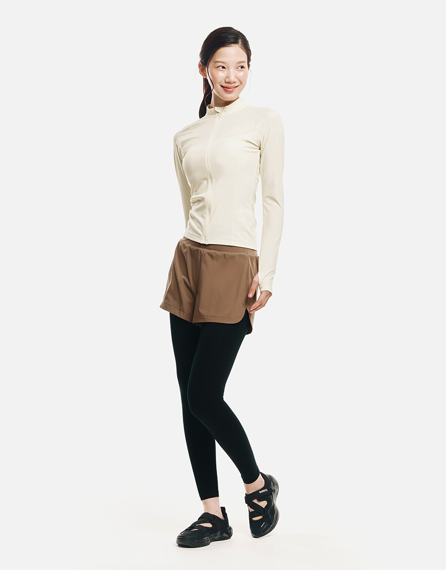 쇼츠 겉감: 폴리에스터 90%, 폴리우레탄 10% / 레깅스 겉감: 폴리에스터 82%, 폴리우레탄 18% / 레깅스 안감: 폴리에스터 73%, 폴리우레탄 27%