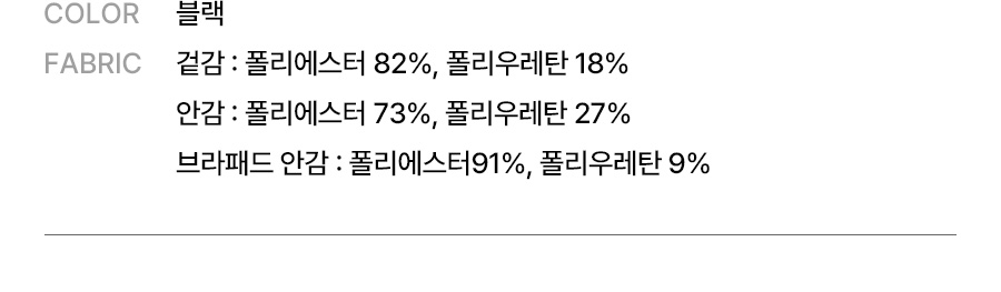 겉감: 폴리에스터 82%, 폴리우레탄 18% / 안감: 폴리에스터 73%, 폴리우레탄 27% / 브라패드 안감: 폴리에스터91%, 폴리우레탄 9%