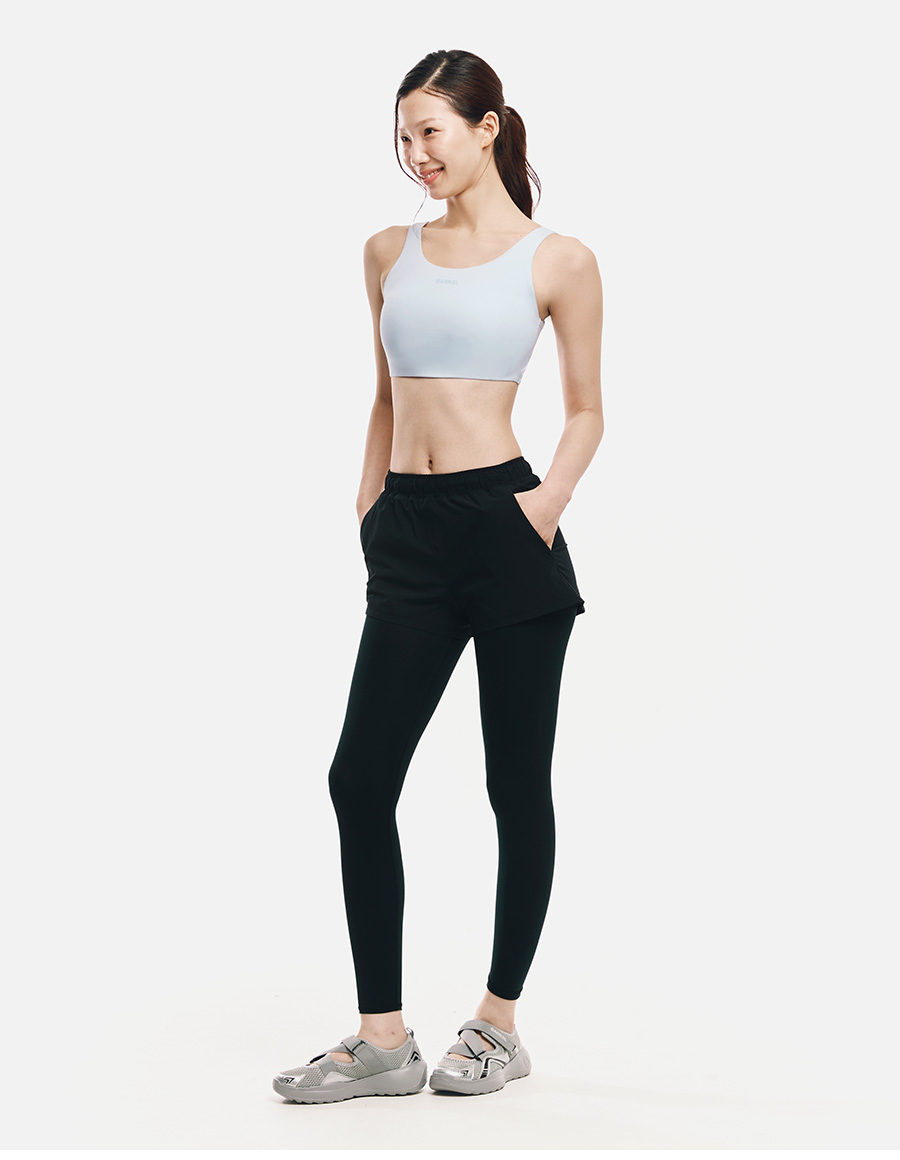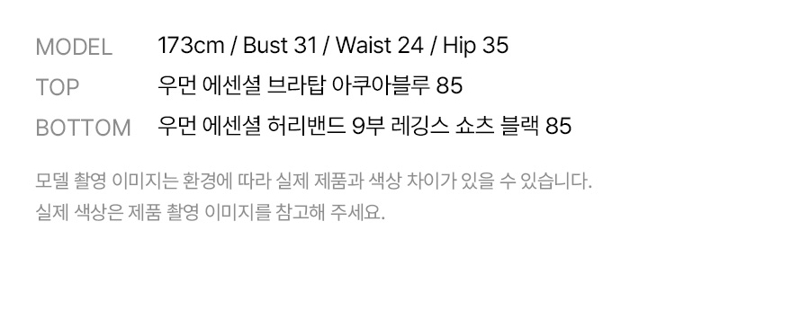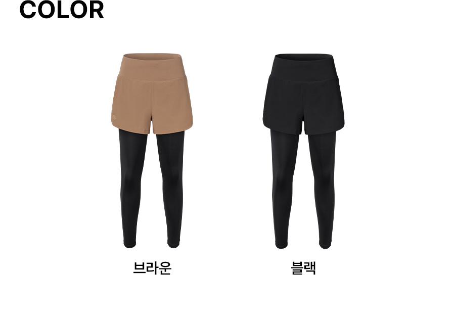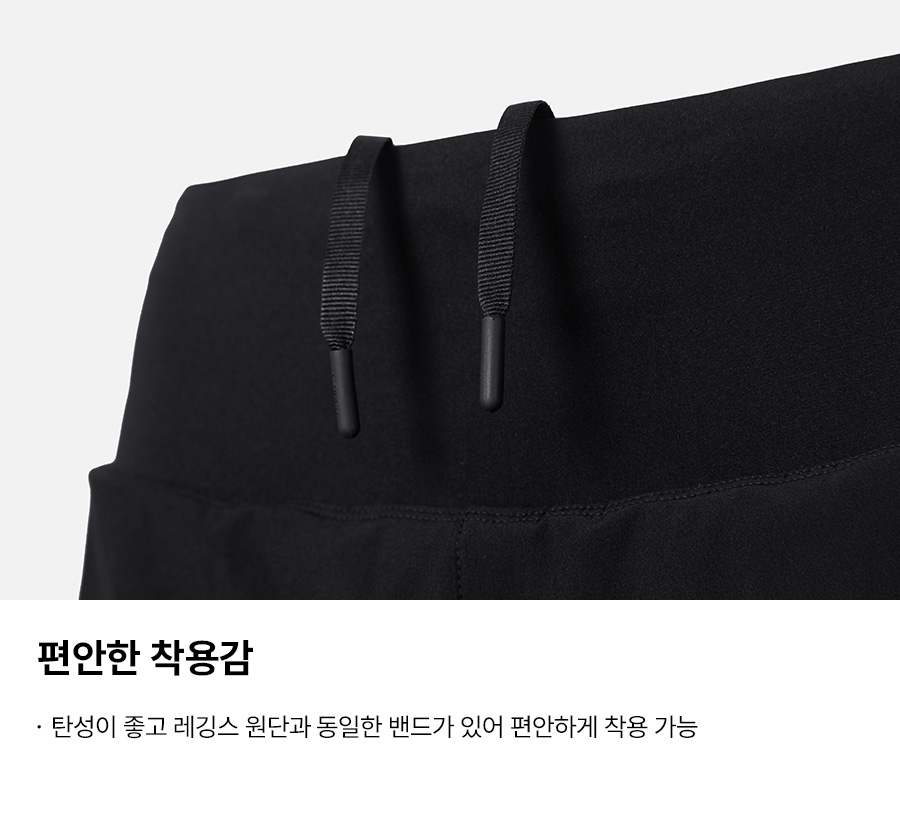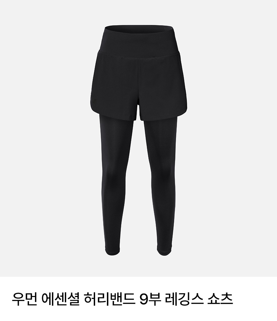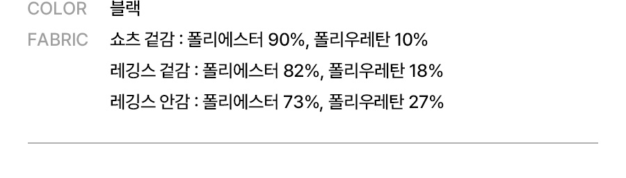 쇼츠 겉감: 폴리에스터 90%, 폴리우레탄 10% / 레깅스 겉감: 폴리에스터 82%, 폴리우레탄 18% / 레깅스 안감: 폴리에스터 73%, 폴리우레탄 27%