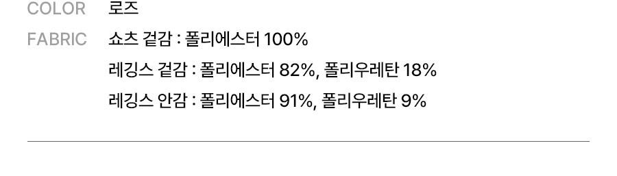 쇼츠 겉감:폴리에스터 100% / 레깅스 겉감: 폴리에스터 82%, 폴리우레탄 18% / 레깅스 안감: 폴리에스터 91%, 폴리우레탄 9%