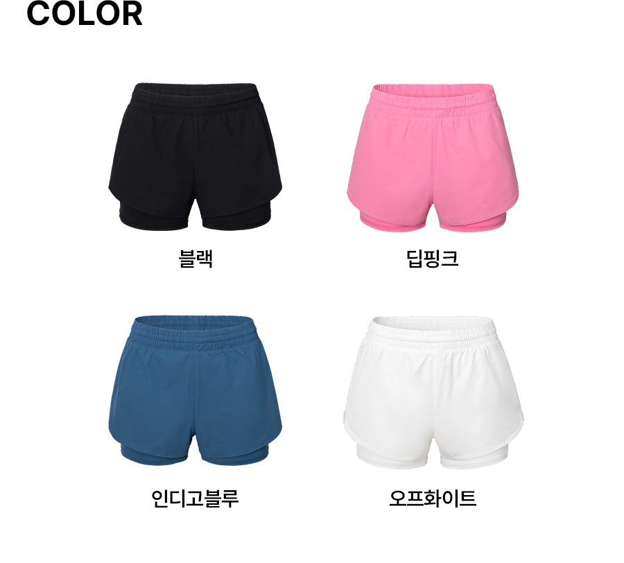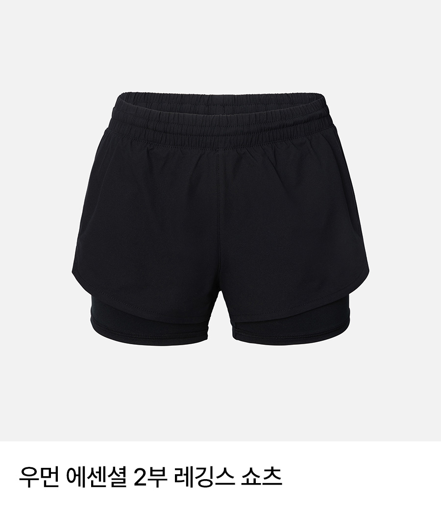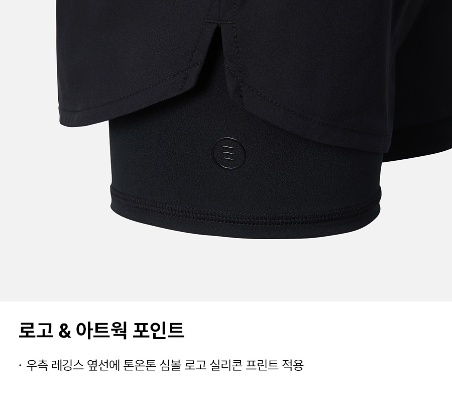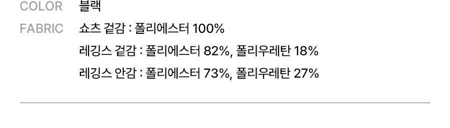 쇼츠 겉감: 폴리에스터 100% / 레깅스 겉감: 폴리에스터 82%, 폴리우레탄 18% / 레깅스 안감: 폴리에스터 73%, 폴리우레탄 27%