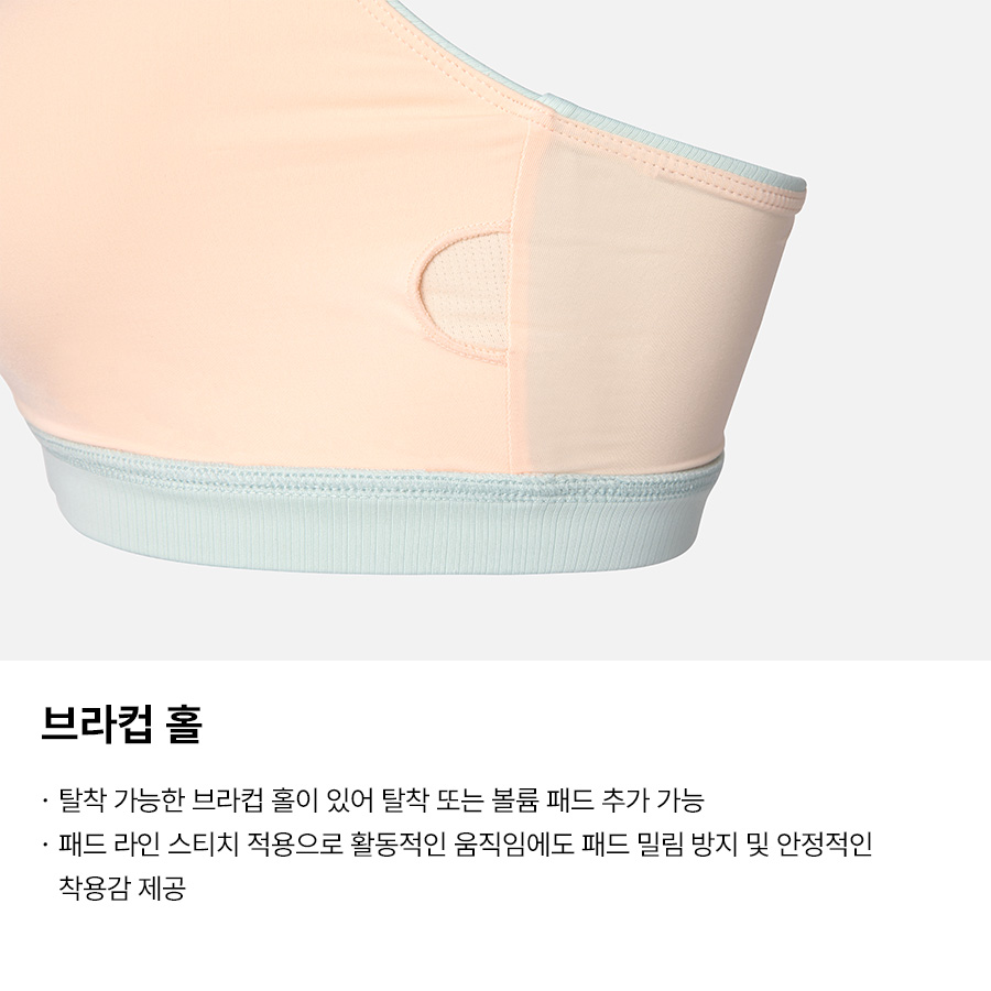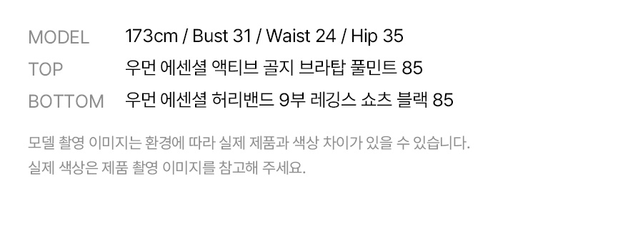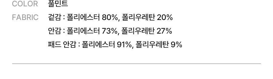 겉감: 폴리에스터 80%, 폴리우레탄 20% / 안감: 폴리에스터 73%, 폴리우레탄 27% / 패드 안감: 폴리에스터 91%, 폴리우레탄 9%