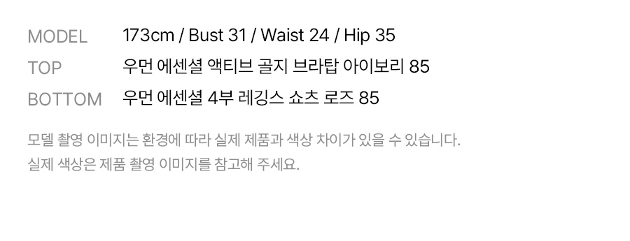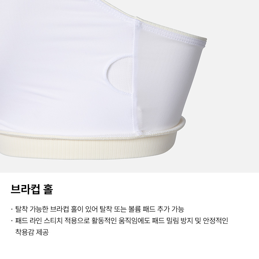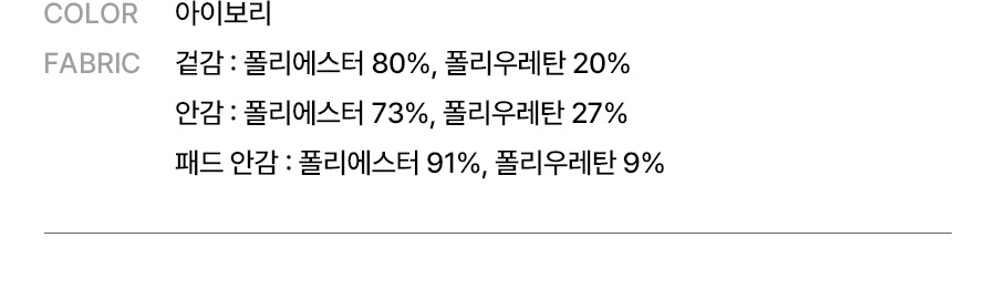 겉감: 폴리에스터 80%, 폴리우레탄 20% / 안감: 폴리에스터 73%, 폴리우레탄 27% / 패드 안감: 폴리에스터 91%, 폴리우레탄 9%