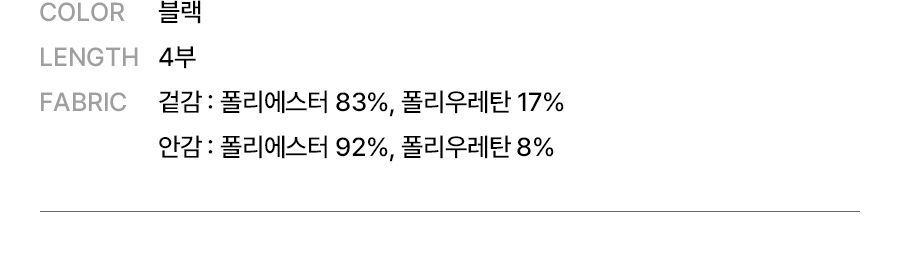 겉감: 폴리에스터 83%, 폴리우레탄 17% / 안감: 폴리에스터 92%, 폴리우레탄 8%