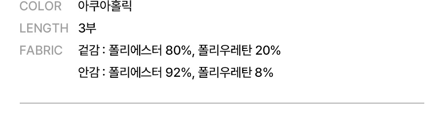 겉감: 폴리에스터 80%, 폴리우레탄 20% / 안감: 폴리에스터 92%, 폴리우레탄 8%