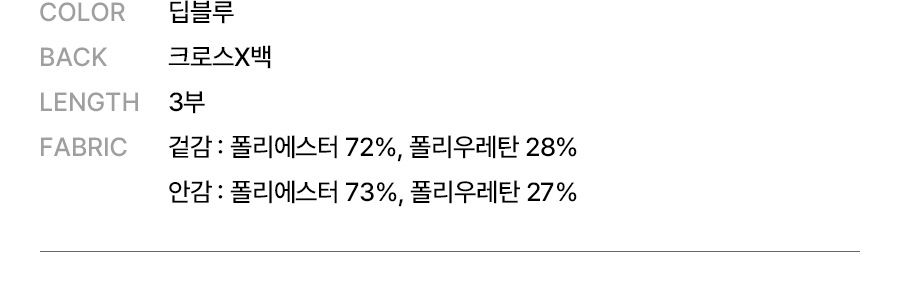 겉감: 폴리에스터 72%, 폴리우레탄 28% / 안감: 폴리에스터 73%, 폴리우레탄 27%