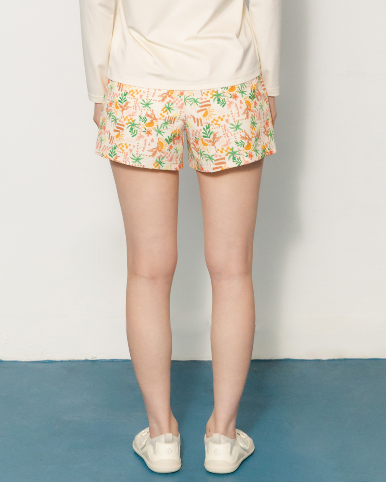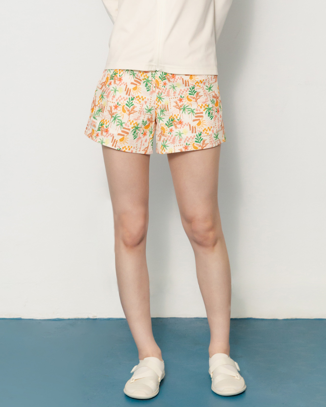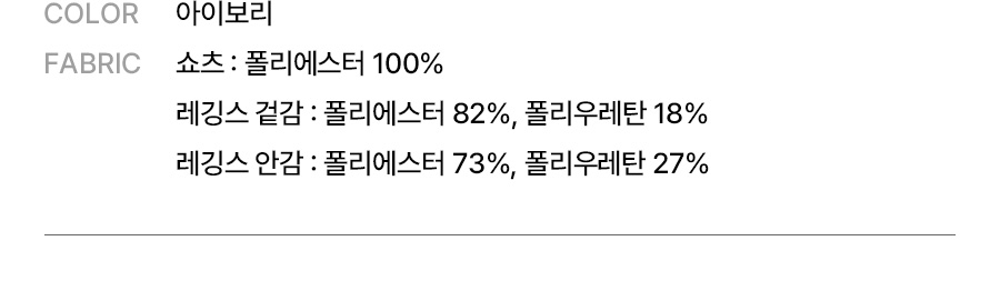 쇼츠: 폴리에스터 100% / 레깅스 겉감: 폴리에스터 82%, 폴리우레탄 18% / 레깅스 안감: 폴리에스터 73%, 폴리우레탄 27%