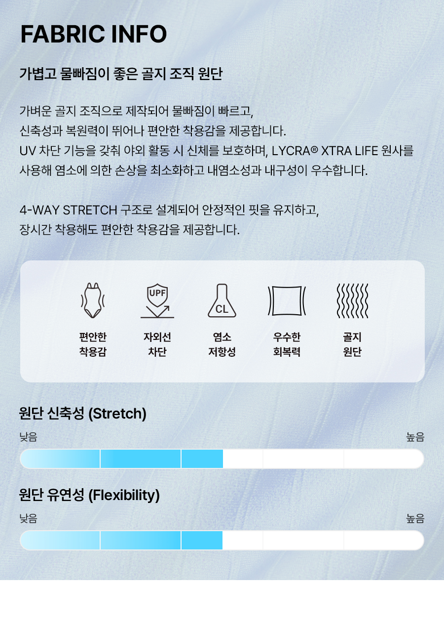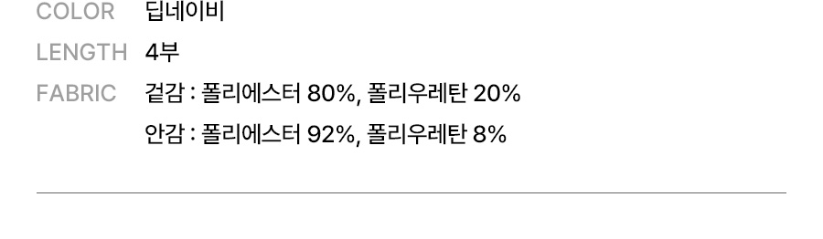겉감: 폴리에스터 80%, 폴리우레탄 20% / 안감: 폴리에스터 92%, 폴리우레탄 8%