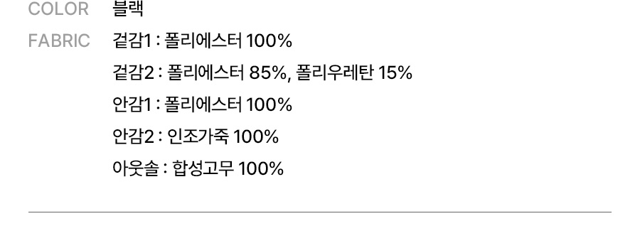겉감1: 폴리에스터 100% / 겉감2: 폴리에스터 85%, 폴리우레탄 15% / 안감1: 폴리에스터 100% / 안감2: 인조가죽 100% / 아웃솔: 합성고무 100%