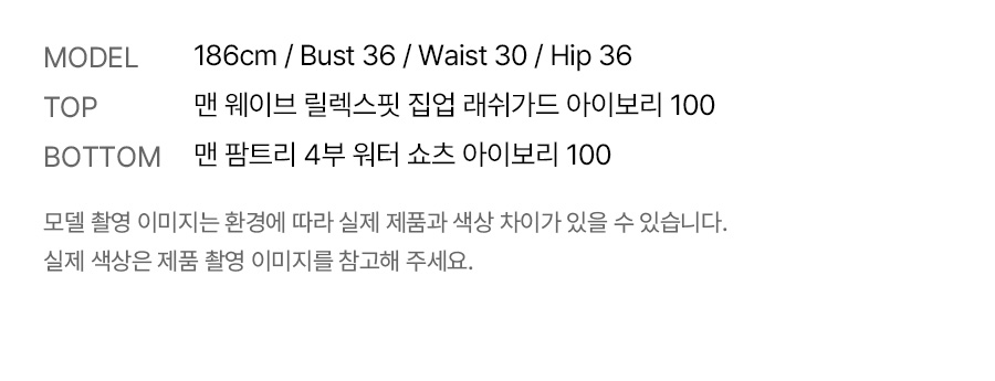 제품을 입고 바닷가나 수영장을 다녀오신 경우, 물 속의 화학성분 및 염분으로 인해 변색이 발생합니다. 땀으로 인한 부분 탈색이 발생할 수 있으니 가능한 한 빨리 수돗물로 세탁하시고 가볍게 두드려서 수분을 뺀 뒤, 직사광선을 피해 그늘에서 건조해주세요.