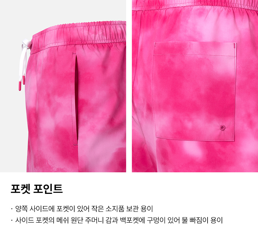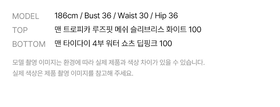 제품을 입고 바닷가나 수영장을 다녀오신 경우, 물 속의 화학성분 및 염분으로 인해 변색이 발생합니다. 땀으로 인한 부분 탈색이 발생할 수 있으니 가능한 한 빨리 수돗물로 세탁하시고 가볍게 두드려서 수분을 뺀 뒤, 직사광선을 피해 그늘에서 건조해주세요.
