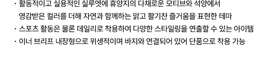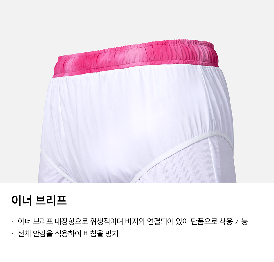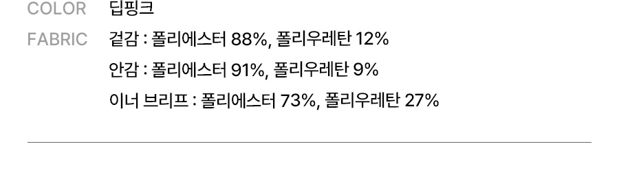 겉감: 폴리에스터 88%, 폴리우레탄 12% / 안감: 폴리에스터 91%, 폴리우레탄 9% / 이너 브리프 : 폴리에스터 73%, 폴리우레탄 27%