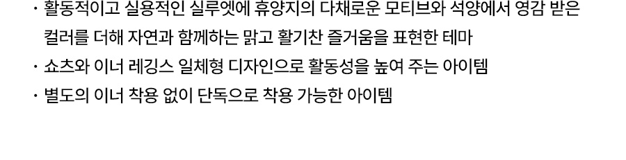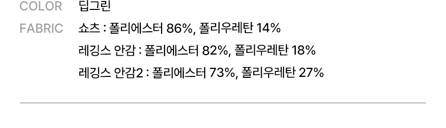 쇼츠: 폴리에스터 86%, 폴리우레탄 14% / 레깅스 안감: 폴리에스터 82%, 폴리우레탄 18% / 레깅스 안감2: 폴리에스터 73%, 폴리우레탄 27%