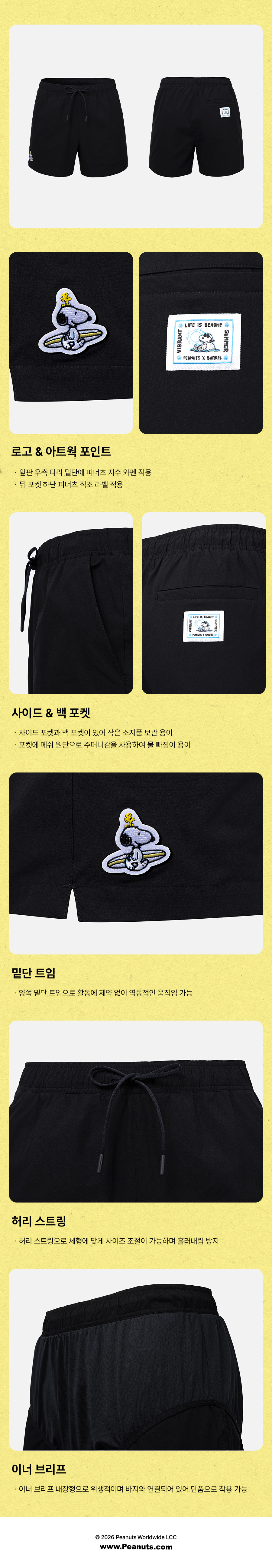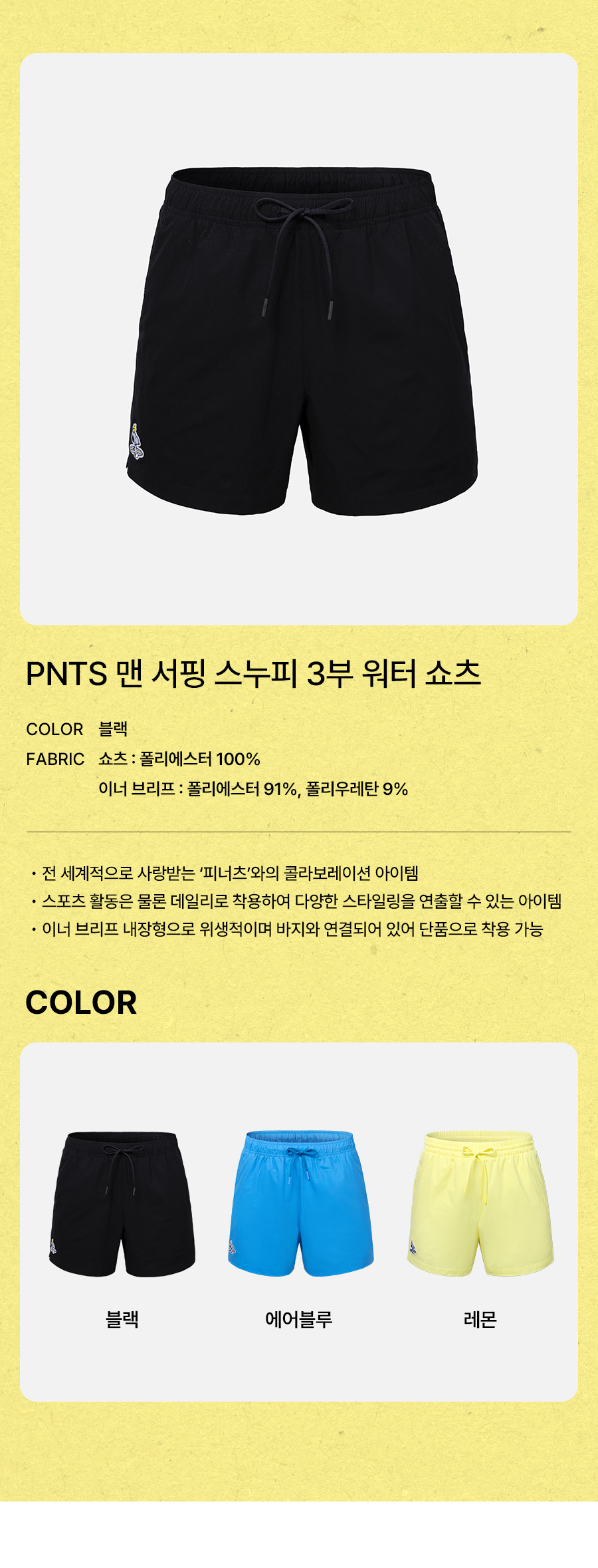 쇼츠: 폴리에스터 100% / 이너 브리프: 폴리에스터 91%, 폴리우레탄 9%