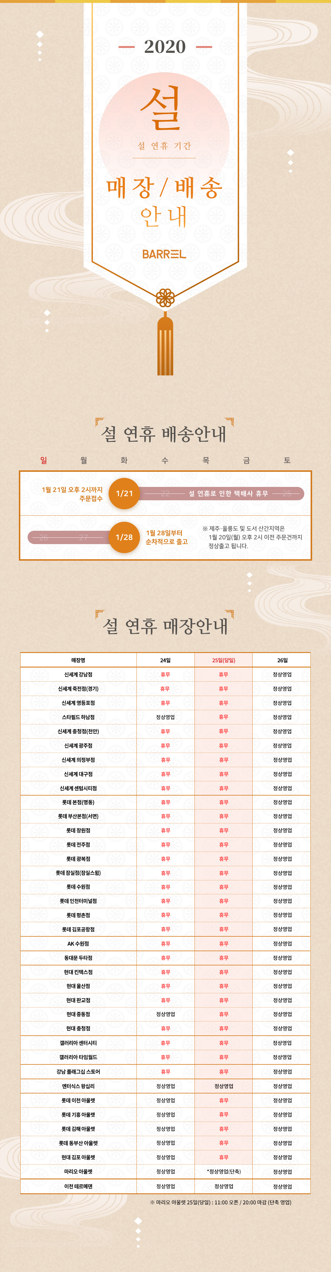 2020 설 연휴 배송 및 매장 안내