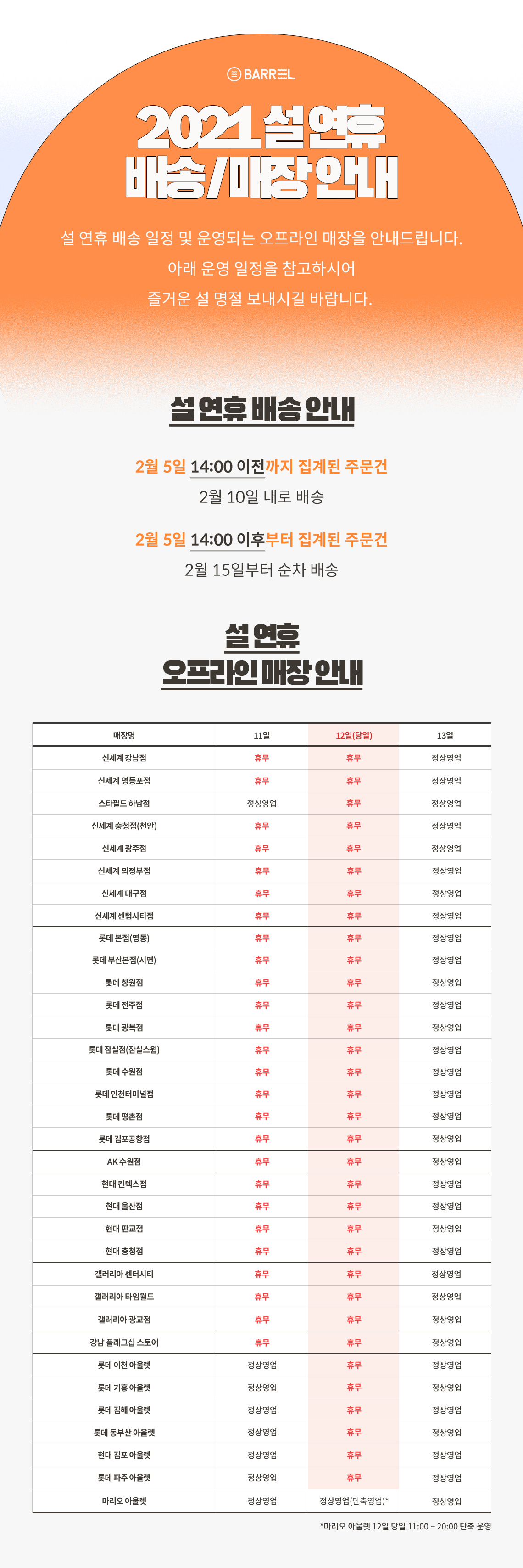 2021 설날 연휴 배송 및 매장 안내