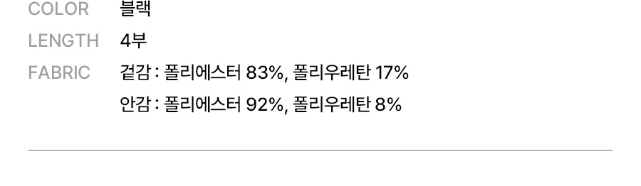 겉감: 폴리에스터 83%, 폴리우레탄 17% / 안감: 폴리에스터 92%, 폴리우레탄 8%