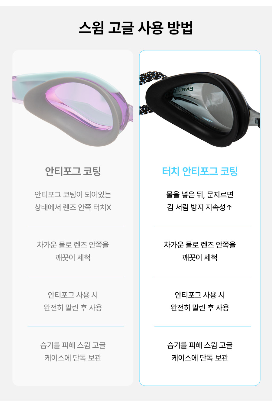 수경&스노클마스크 전용 김 서림 방지 용액을 사용 시, 물로 깨끗이 헹군 후 보관하시기 바랍니다.