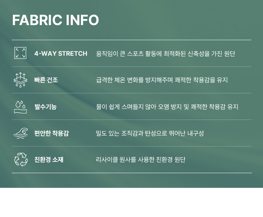 사용 후 즉시 20~30도 사이의 미지근한 물에 소금기가 가실 정도로 씻어주는 것이 좋습니다. 뜨거운 물에 세척하거나 찬물에 오래 방치할 경우 원단 유연성에 변화가 올 수 있습니다.