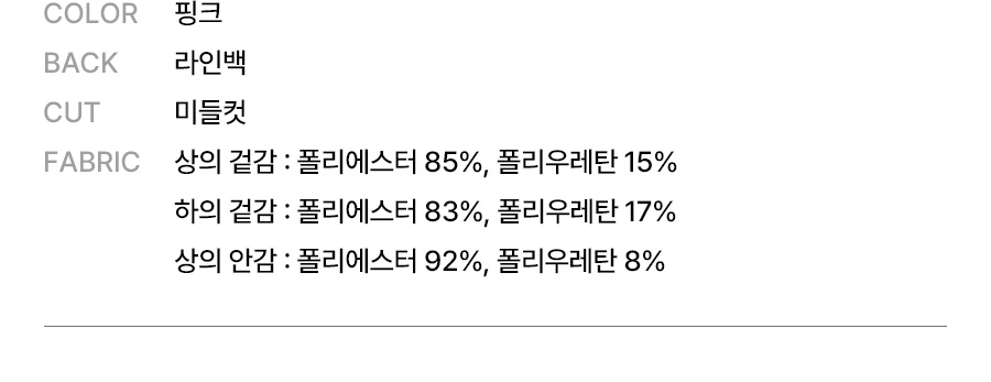 상의 겉감: 폴리에스터 85%, 폴리우레탄 15% / 하의 겉감: 폴리에스터 83%, 폴리우레탄 17% / 상의 안감: 폴리에스터 92%, 폴리우레탄 8%