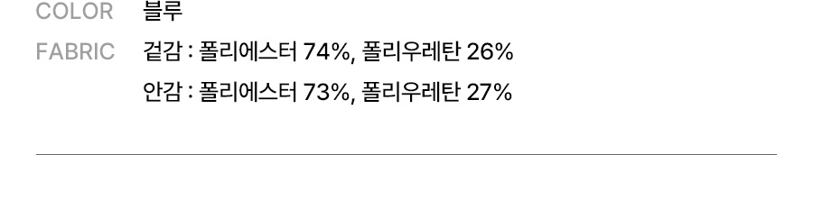 겉감: 폴리에스터 74%, 폴리우레탄 26% / 안감: 폴리에스터 73%, 폴리우레탄 27%